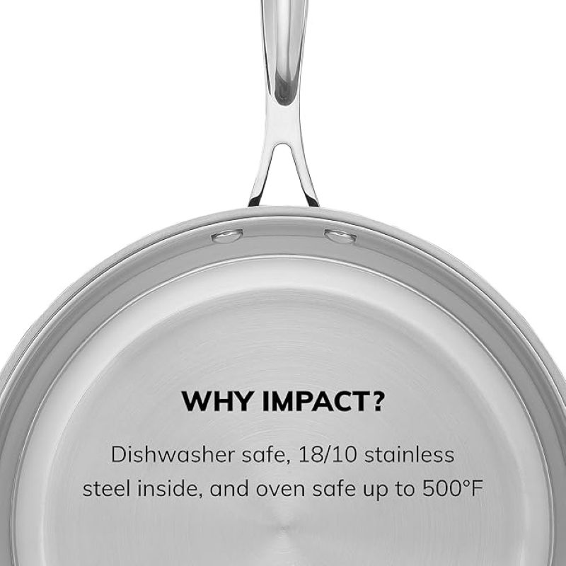 Dòng sản phẩm Impact đến từ Scanpan gồm nồi chảo inox cao cấp, được tinh chế với đáy 3 lớp chứa lõi nhôm nguyên chất, được bao bọc bởi lớp inox chắc chắn - không chỉ tăng cường độ bền mà còn tương thích hoàn hảo với mọi loại bếp, kể cả bếp từ. Thép không gỉ nổi tiếng với độ bền, chống mài mòn theo thời gian, mang lại sự yên tâm lâu dài. Còn nhôm mang lại khả năng dẫn nhiệt vượt trội, giúp phân bổ nhiệt đều và tiết kiệm năng lượng.