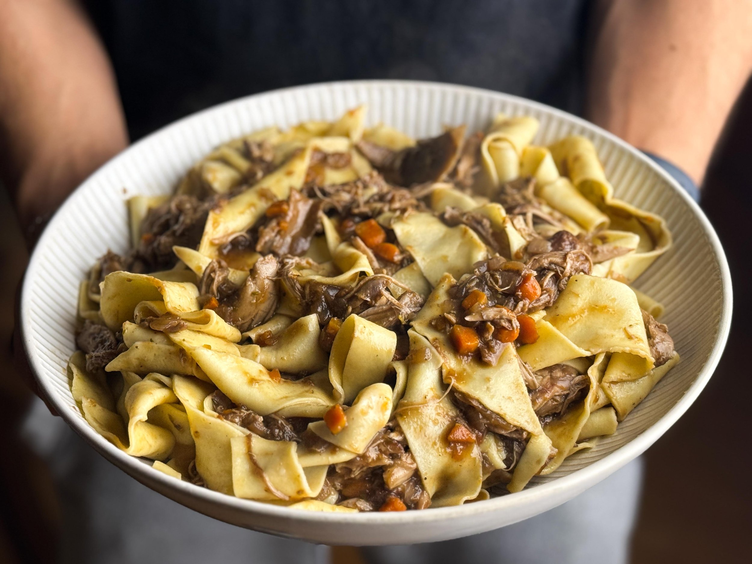 Mỳ Pappardelle (mỳ trứng dẹt bản to) với sốt vịt hầm Chân vịt hầm trong vòng 2 tiếng với rượu vang đỏ, sốt cà ch...